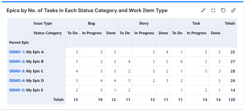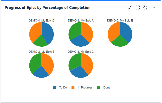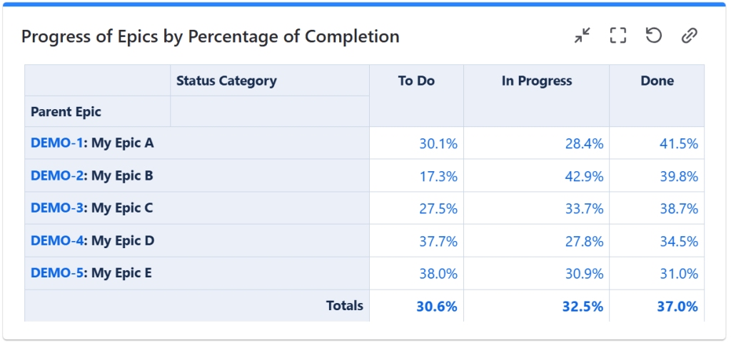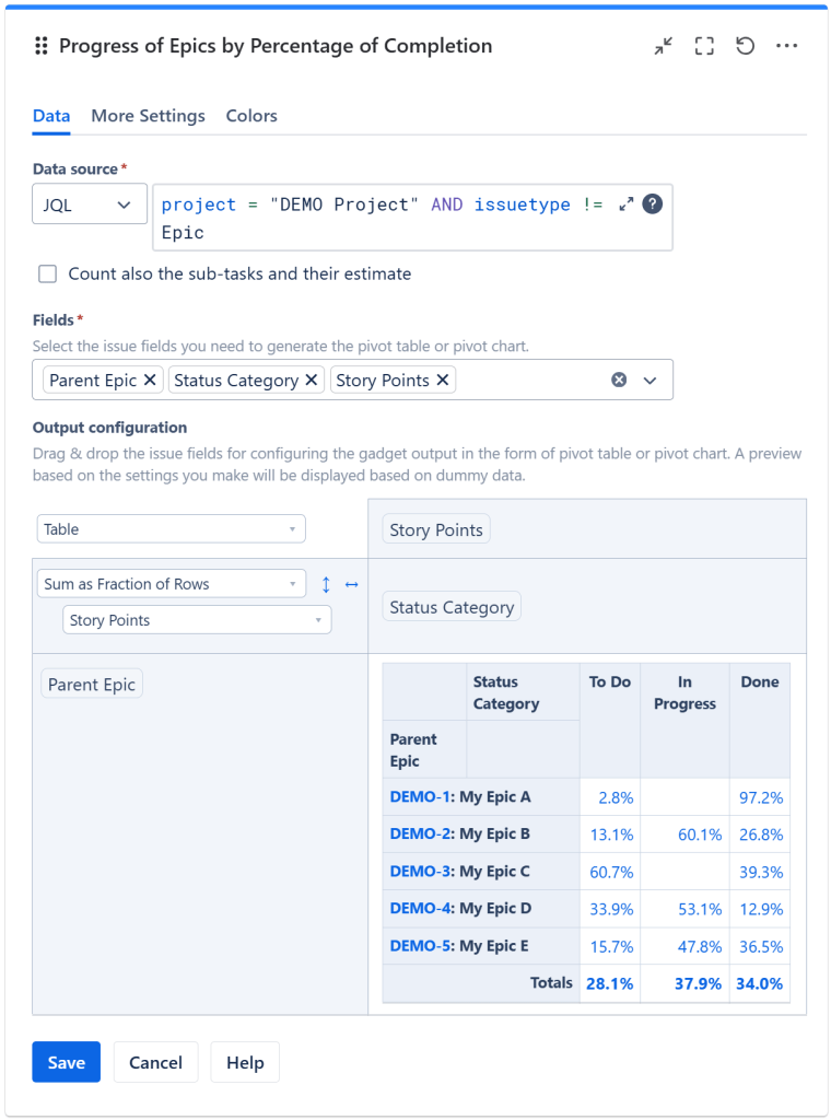 This is one of the most convenient and easy ways to display the progress of the epics. The Pivot Table & Pivot Chart gadget lets you calculate and display the completion of the epics based on their child issues (Stories, Tasks and even Sub-tasks). It can calculate the progress based on the current status of the issues, by the current status category (To Do, In Progress and Done), or by issue count or sum of a numeric field such as Story Points.