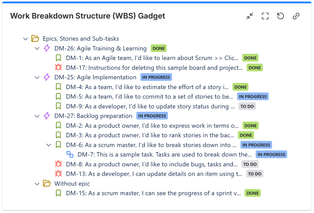 The Work Breakdown Structure (WBS) gadget offered by Great Gadgets app helps you visualize the hierarchy of epics and their child issues in a structured, tree-like format along with their current status, thus giving you a quick overview of the project work and progress.