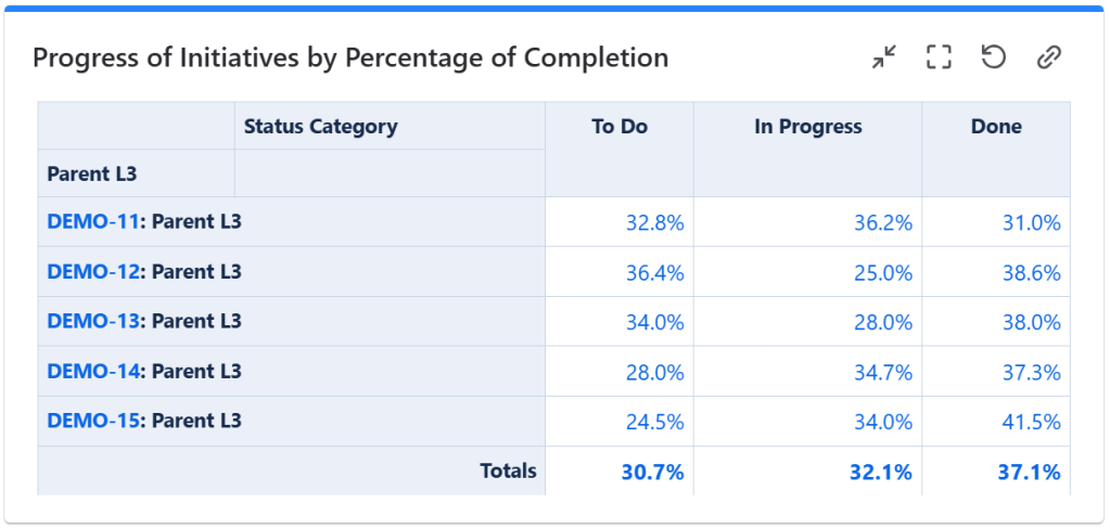 Tracking the progress at initiative or theme level in Jira shows the progress towards achieving the organization’s strategic goals.