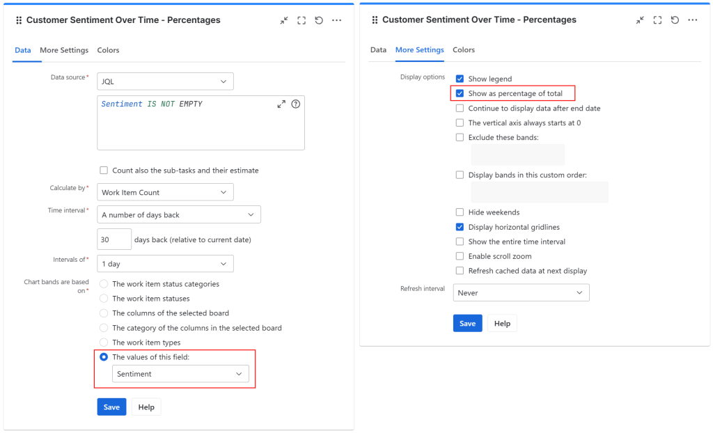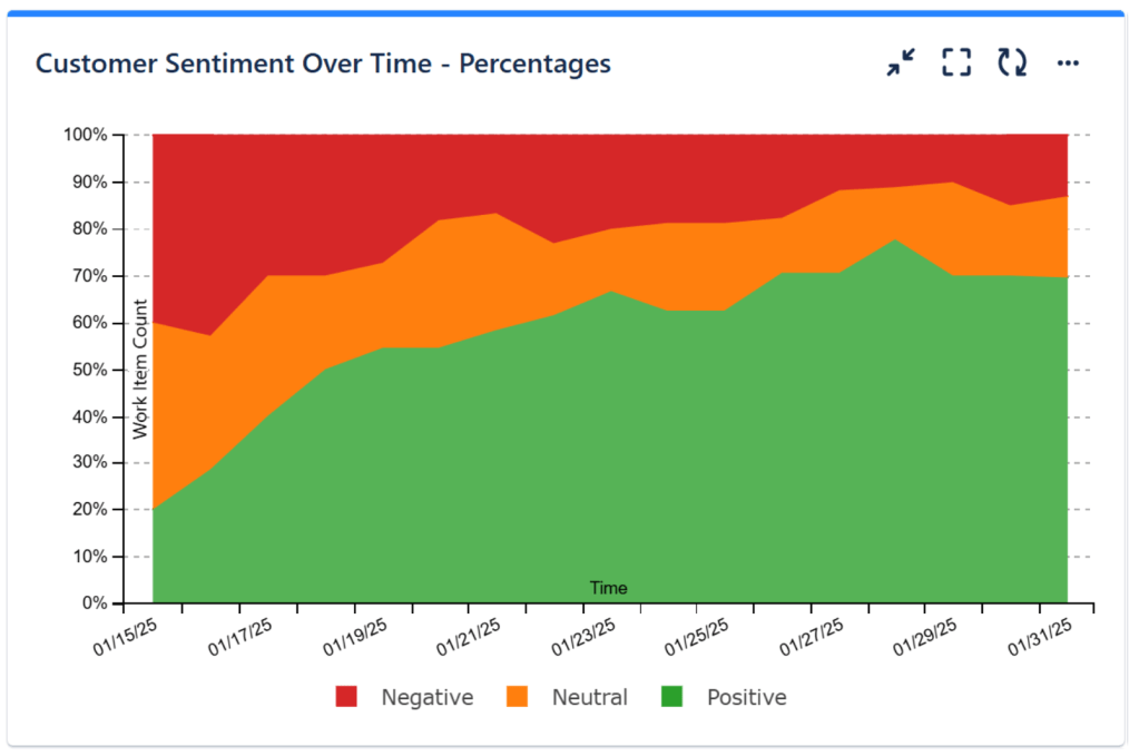 Another effective way to track customer sentiment is by using the Cumulative Flow Diagram gadget offered by the same app. Traditionally used for monitoring workflow stability, this gadget can also be configured to track the Sentiment over time.