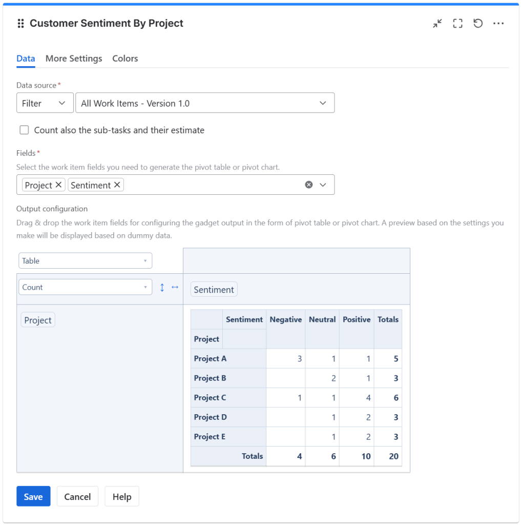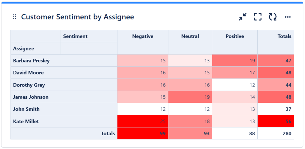 By using Pivot Table & Pivot Chart gadget offered by Great Gadgets you can display the actual count or the percentage of issues based on their Sentiment field. This gadget allows you to display stats based on Sentiment in form of tables, heatmap tables or charts of various types. You can group and display customer sentiment by various fields such as project or assignee.