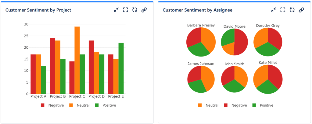 If you enabled AI Sentiment Analysis feature in your JSM project, you can complete your dashboards with gadgets from Great Gadgets that shows stats based on the Sentiment field of the issues.