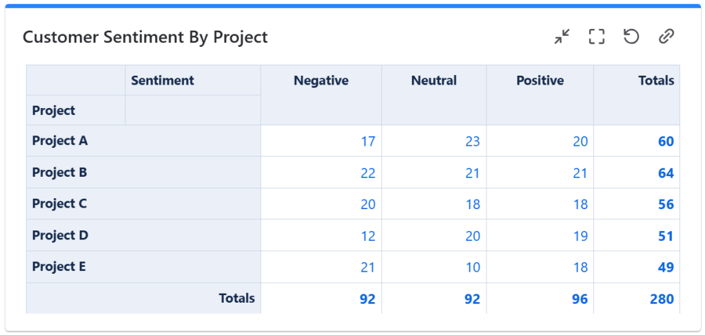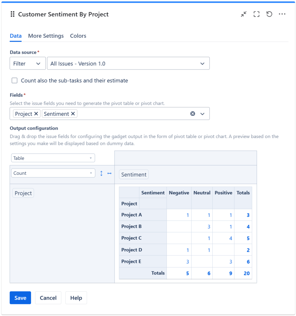 One powerful way to utilize Pivot Table & Pivot Chart Gadget offered by Great Gadgets app is to track customer sentiment across different projects in Jira. This helps organizations understand which projects generate the most positive or negative feedback, allowing them to improve support processes where needed.