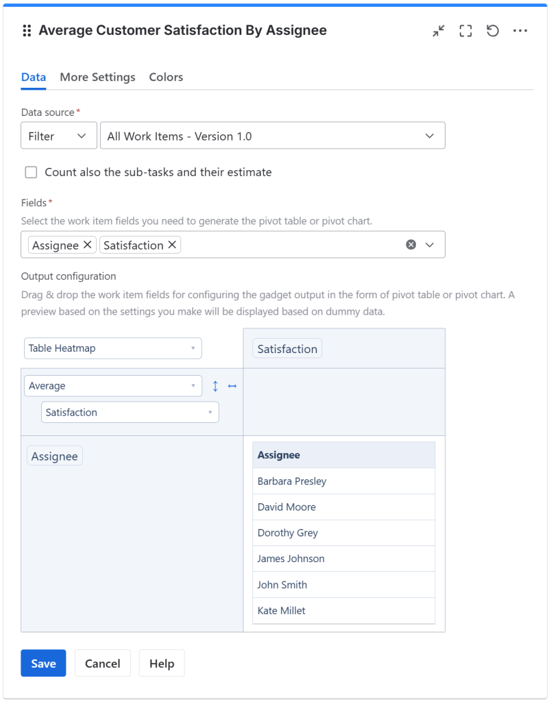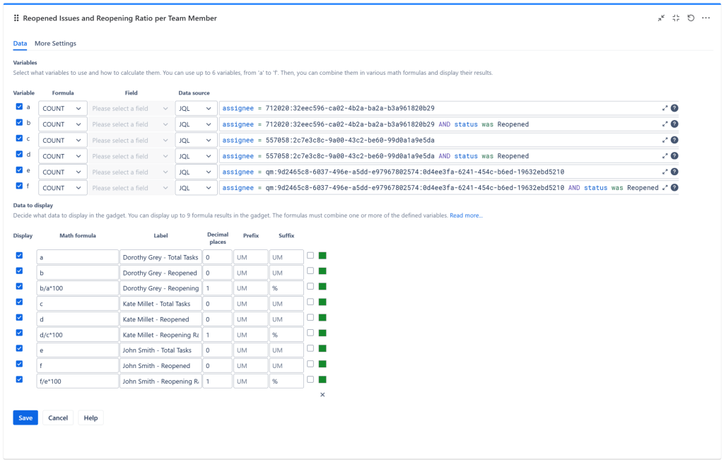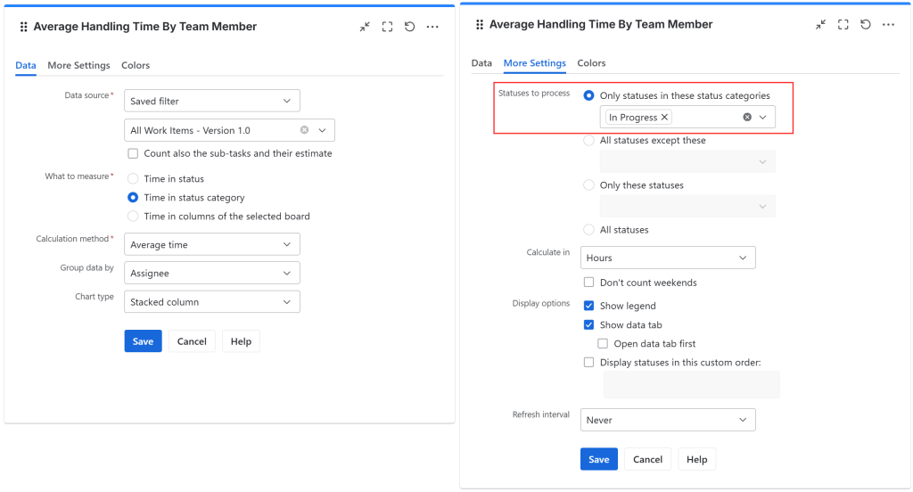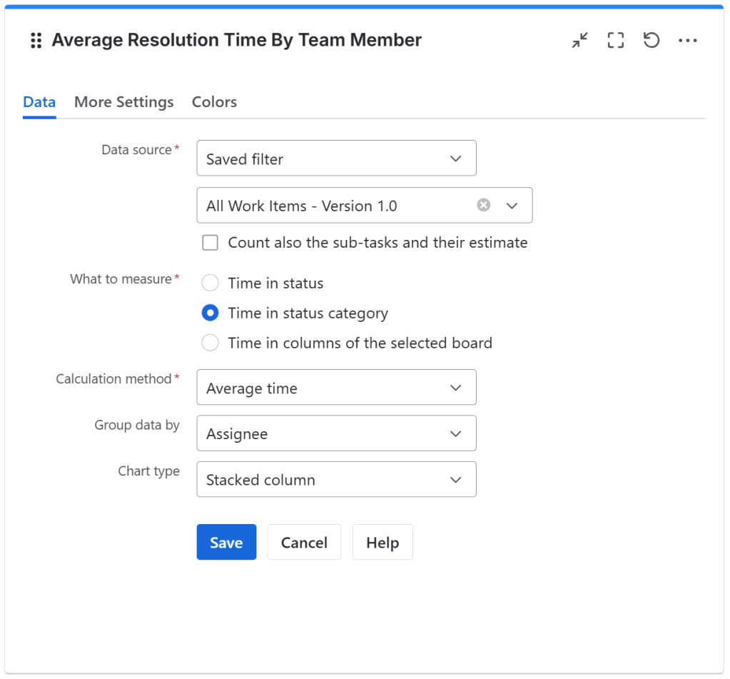 This metric shows how quickly each person resolves their assigned issues. You can measure this by using the Time In Status gadget offered by Great Gadgets configured to calculate the average time in the workflow statuses prior to Done and group data by Assignee. This will allow you to better monitor SLA performance or spot bottlenecks in specific statuses for each team member.