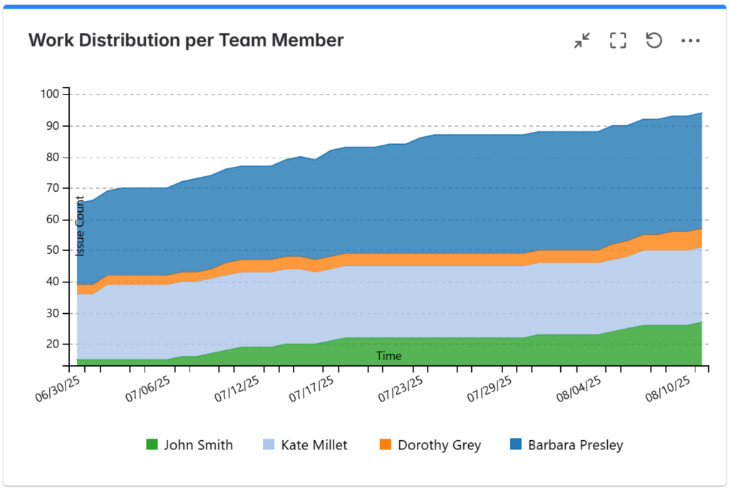 By setting the Assignee field as the grouping option, the chart’s colored areas will represent each team member instead of the workflow statuses. This allows to instantly see how much work each person has been handling at any given time. It is a great way to identify if some team members are constantly overloaded or if work is spread evenly across the team.