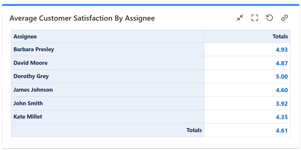 Average Customer Satisfaction Score (CSAT) measures how happy customers are with the service they’ve received from each team member. In Jira Service Management (JSM), or similar help desk setups, this usually comes from post-resolution surveys where customers rate their experience.