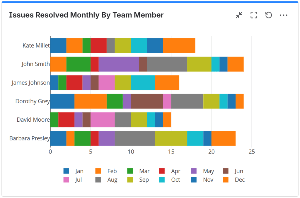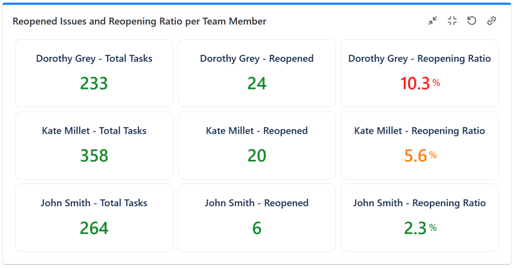 A reopened issue is an indicator that the original resolution didn’t fully address the problem. Tracking the number of reopened issues — and the reopening ratio — per team member can help uncover quality issues, misunderstandings in requirements, or process gaps.