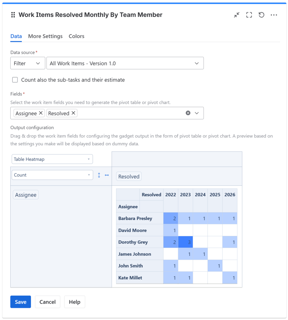 Throughput measures how many issues each team member completes in a given timeframe (week, month, or sprint). Use the same Pivot Table & Pivot Chart gadget from Great Gadgets to visualize how many issues each team member completes per month, for example.