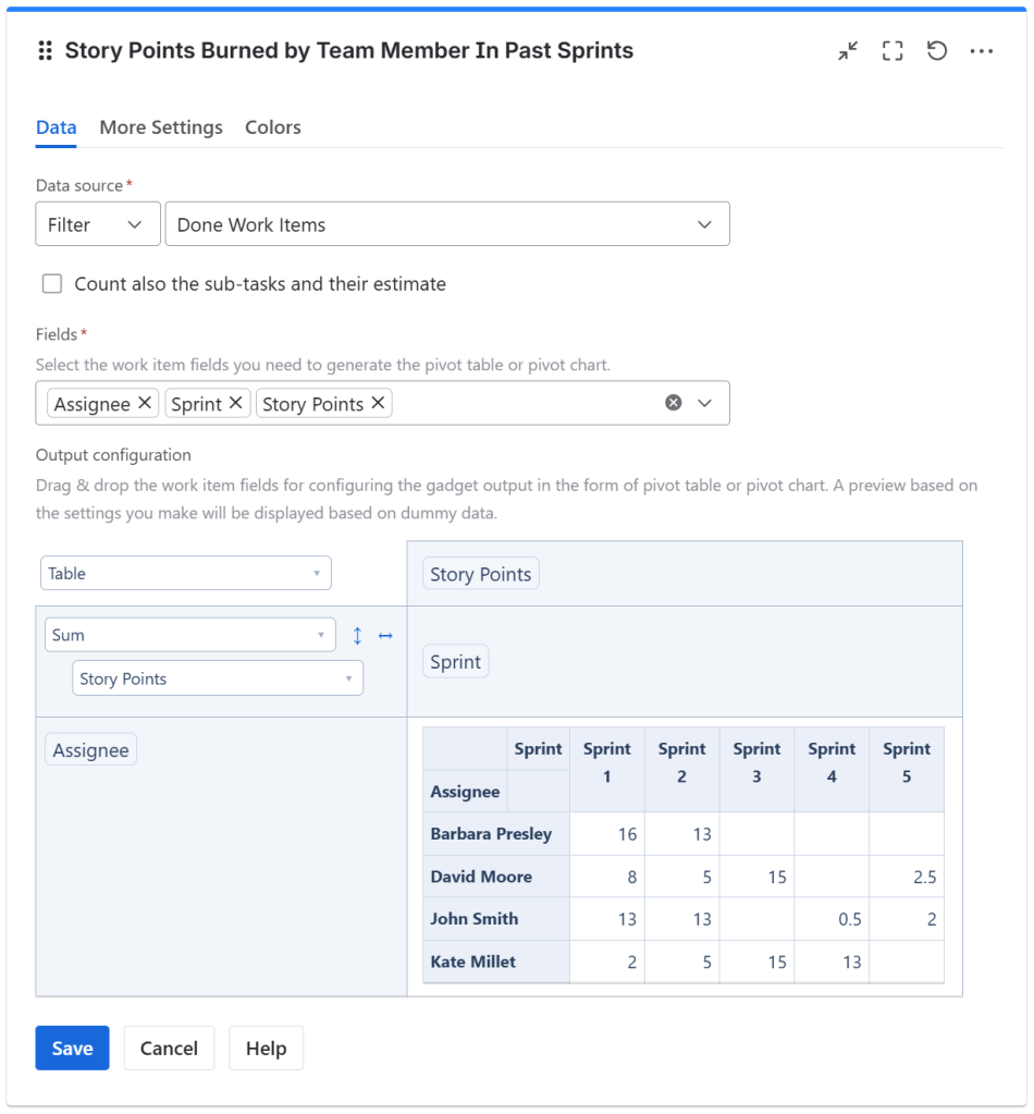 Using the Pivot Table & Pivot Chart gadget offered by Great Gadgets, you can create dynamic reports that show how much work each team member completed in past sprints.