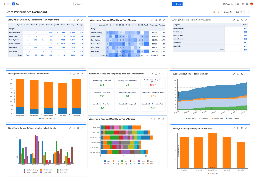 By focusing on these metrics and combining these gadgets – Pivot Table & Pivot Chart, Time in Status, Cumulative Flow Diagram, and Advanced Issue Filter Formula – you can build a complete Jira dashboard for tracking team performance. Such a dashboard gives you both the big-picture view of overall productivity and the granular insights into each team member’s contributions, helping you make data-driven decisions, balance workloads, and improve team efficiency over time.