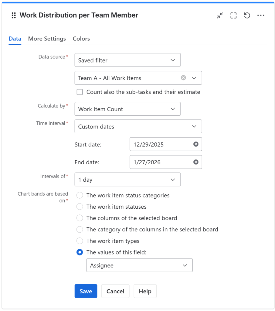 The Cumulative Flow Diagram (CFD) is often used to visualize overall work distribution and how work moves through different stages of the workflow over time. However, using the Cumulative Flow Diagram chart offered by Great Gadgets, you can configure it to show work distribution per team member, giving you a unique perspective on individual performance and workload balance.
