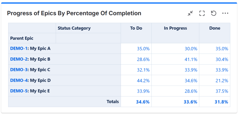 For more detailed information on how this can be achieved, see this article: How to display the progress of Epics, Initiatives and Themes in Jira or Confluence with Great Gadgets
