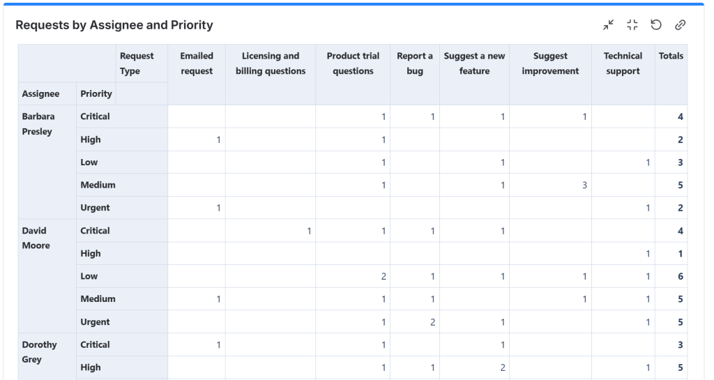 Support teams can use pivot tables to monitor service performance. They may need to track tickets by status and assignee to balance workloads, analyze requests by type to identify recurring problems, group tickets by priority to focus on critical issues, monitor SLA breaches or track customer’s sentiment and feedback.