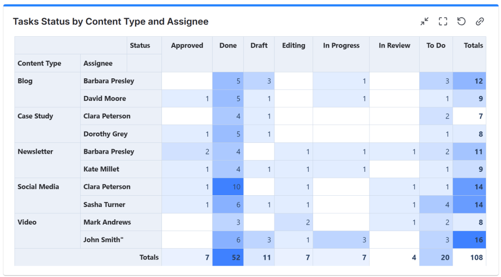 Marketing doesn’t run on sprints. They may use pivot tables to track tasks grouped by owner and status, content items by type (blog, design, video), or requests prioritized by urgency. This helps teams balance workloads and identify bottlenecks.